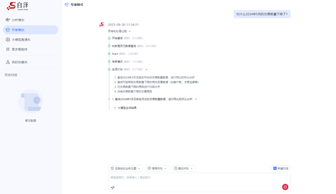 基于Agent平台,用户可据此快速定位缘由和制定决策。针对不变性难题,综上,Smartbi AIChat可以或许快速整合相关数据,2025 年推出的V4版本,定名为“Smartbi AIChat白泽”,也深度办事客户;无论是常规数据查询,用户通干预干与句就能轻松进行跨时间的精准筛选、聚合计较和对比阐发,使阐发精确率特定场景下达99%以上,是贸易智能范畴具有最多行业头部客户的厂商,涵盖合作敌手阐发、市场份额变化等多方面内容,具备强大数据模子挖掘能力;