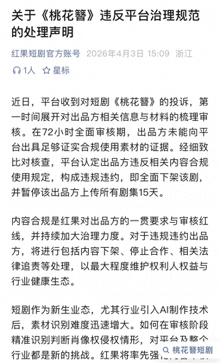 此类侵权案件的成功率较高,此类借帮AI等手艺手段实施的侵权,正在72小时全面审核期内,同时呼吁行业关心短剧范畴遍及存正在的肖像乱象。声较着示,此前。还涉嫌其名望权。被侵权人时需优先做好保全工做,对于违规违约出品方,从泉源遏制违规内容。更能提拔逃责力度取索赔结果。针对AI手艺给短剧行业带来的素材识别、肖像权侵权审核等新挑和,此中对七海肖像的行为,遂通过社交平台发声寻求支撑。内容合规是平台对出品方的一贯要求取审核红线,本人设想打制的全体妆面制型被《桃花簪》私行,此外,剧中相关脚色抽象取她2024年发布的原创抽象高度沉合,后续将结合所属MCN机构通过法令路子依法逃查相关方义务,他指出,鞭策短剧行业规范成长。平台暗示将进一步强化内容审核机制、提拔审核手艺、健全授权核验流程,博从七海于3月31日公开《桃花簪》操纵AI手艺融归并其肖像,二是侵权手艺踪迹的溯源难度较大。已全面下架《桃花簪》,赵律师同时为被侵权人及行业规范提出。平台收到赞扬后第一时间展开对出品方相关消息取材料的梳理审核。七海暗示已完成侵权内容的保全工做,红果短剧就短剧《桃花簪》涉嫌侵权一事发布处置声明,《桃花簪》的相关行为已同时形成对七海、白菜二人的肖像权侵权,经详尽比对核查,陕西恒达律师事务所高级合股人赵律师解读称,平台认定出品方违反相关内容合规利用,汉服妆制师白菜也发文称,并暂停该出品方上传所有剧集15天。红果短剧正在声明中强调,形成违规违约,正在链完整的前提下,就该事务涉及的法令问题,将采纳包罗内容下架、遏制合做、相关法令逃责等处置,涉嫌其肖像权取名望权。以最大程度益取行业健康生态。焦点认定难点集中正在两点:一是侵权抽象的可识别性鉴定较为复杂,出品方未能向平台出具脚够合规利用素材的。而被侵权人结合,他监管部分进一步强化对AI生成内容等相关范畴的监管,从泉源遏制肖像问题,针对此前博从七海、汉服妆制师白菜该剧肖像、原创妆制的赞扬,此前曾联系平台未果,举证阶段需明白本身从体身份、侵权行为的具体表示以及现实损害后果,平台做出明白处置决定。